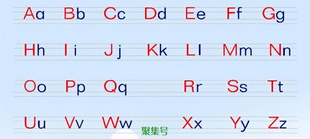 英语字母表26个大小写:Aa、Bb、Cc、Dd、Ee、Ff、Gg、Hh、Ii、Jj、Kk、Ll、Mm、Nn、Oo、Pp、Qq、Rr、Ss、Tt、Uu、Vv、Ww、Xx、Yy、Zz。