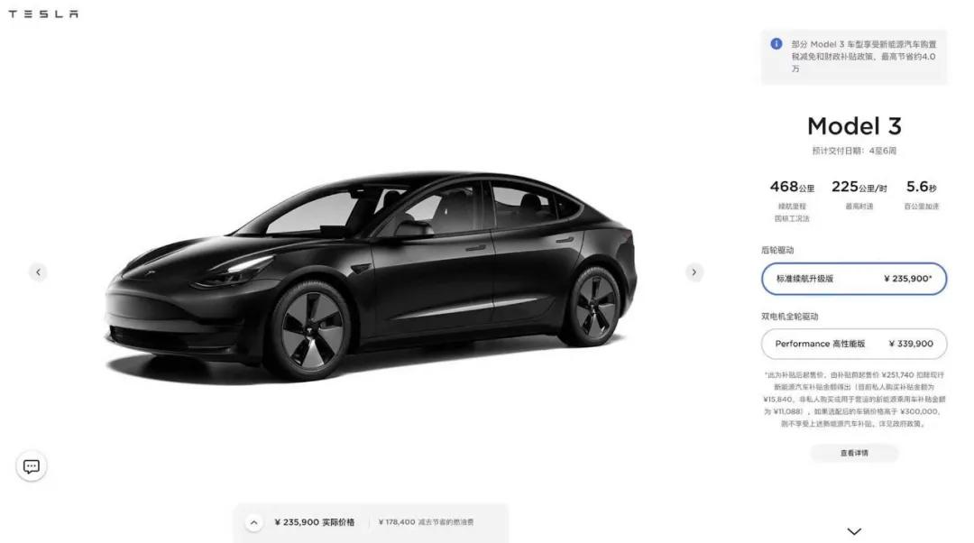 特斯拉官方宣布:即日起,特斯拉Model 3标准续航升级版的价格下调15000元人民币,调整后的价格为235900元人民币(此为补贴后起售价)。