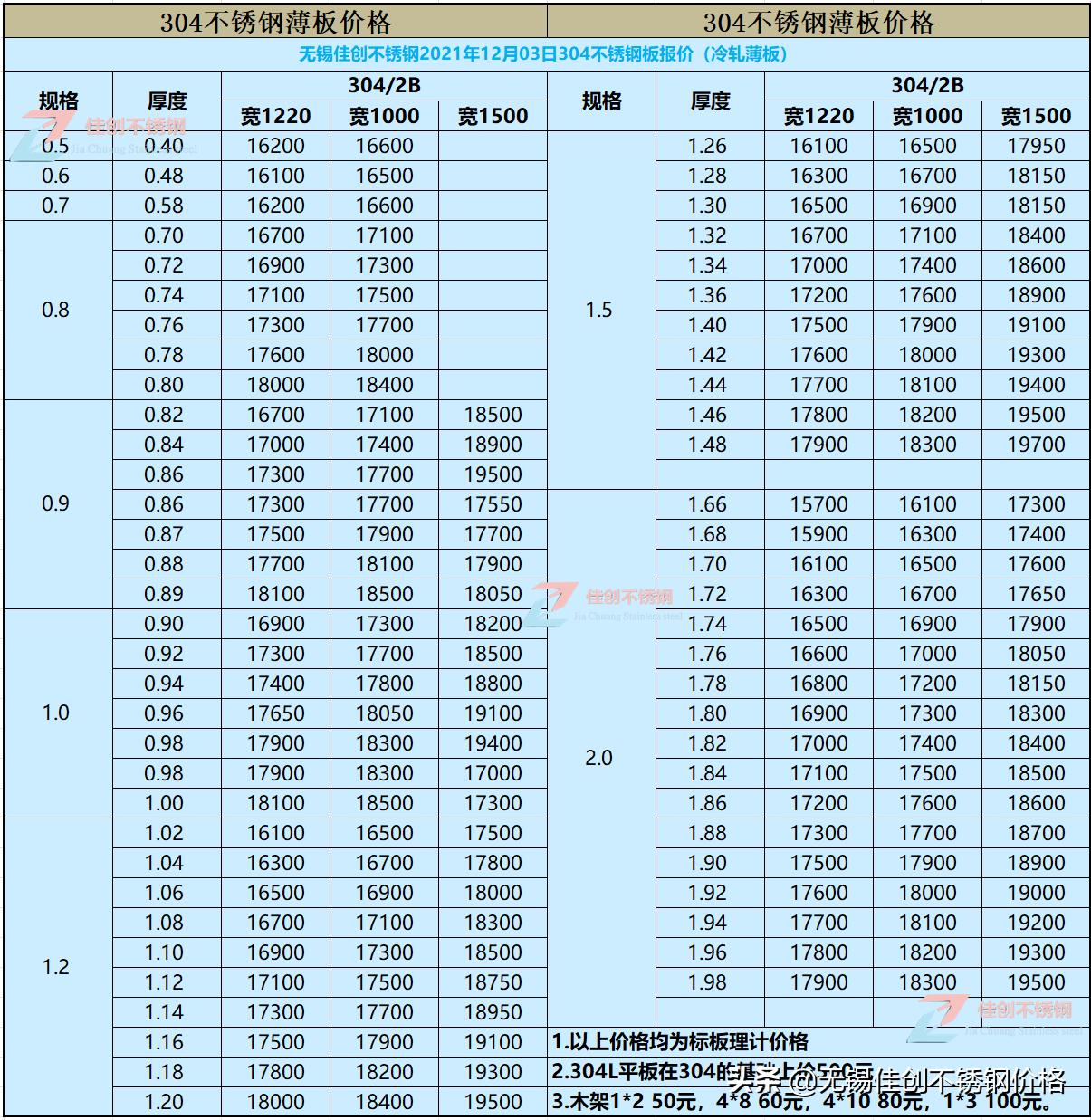 2021年12月3日无锡佳创304不锈钢板价格表: