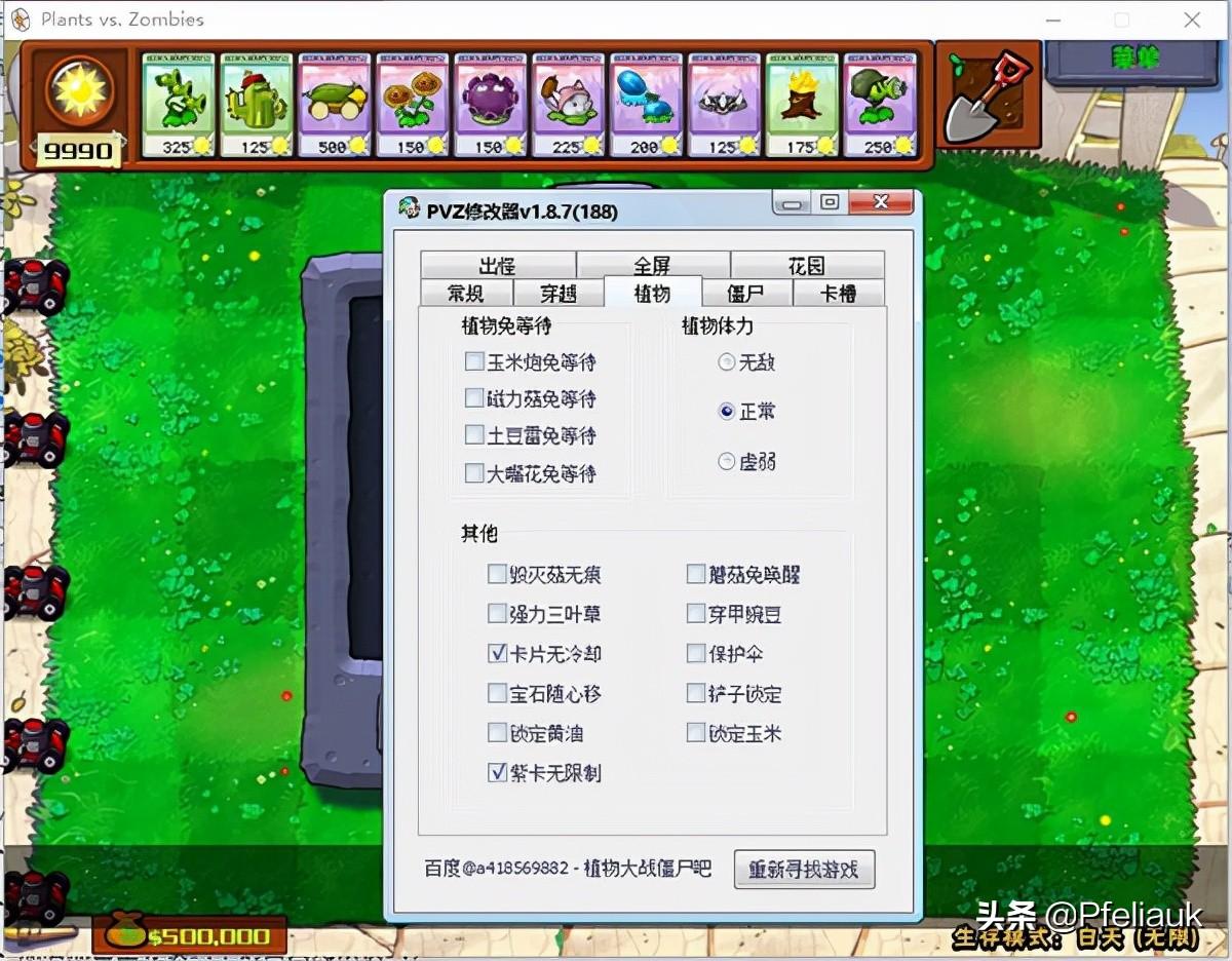 8、比如卡片无冷却、紫卡无限制、毁灭菇无痕、玉米炮免等待等等,其中紫卡无限制的意思是冰西瓜、双生向日葵等需要二次种植的植物可直接进行种植;