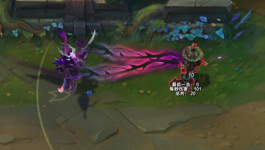 但是游戏内的魔腾模型没有原画这么粉嫩,整体色系偏暗,被动触发时周围还有黑雾和符文特效。其他技能中q技能的前端是古神的头部,路径上则是枯萎的花草特效。e技能会伸出黑色荆棘缠绕对方,恐惧时敌人身上还有魔腾的脸。大招不太好做特效,就在被选中的敌人脚下加了古神的符文。整体来说这款皮肤的性价比和特效表现都是不错的,用腻了上古战魂的可以试试。