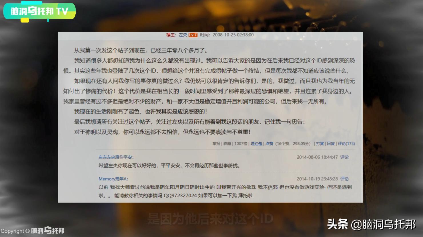“对于神明以及灵魂,你可以永远都不去相信,但永远也不要亵渎与不尊重!”这是左央在消失三年之后,于2008年,在天涯论坛的帖子中,留下的一句话。喜欢探灵的朋友们可能都听说过左央事件。2005年,天涯论坛一名id为左央的用户,为探究世界上是否真的有鬼神的存在,决定亲身尝试各种通灵游戏,并将结果以文字的形式在天涯论坛播报。事后,随着左央的神秘消失,他的帖子被炒到了空前的热度。左央事件也成了天涯论坛上有史以来最大的悬案。今天咱们就来深扒一下左央事件,看看在他身上究竟发生了什么。