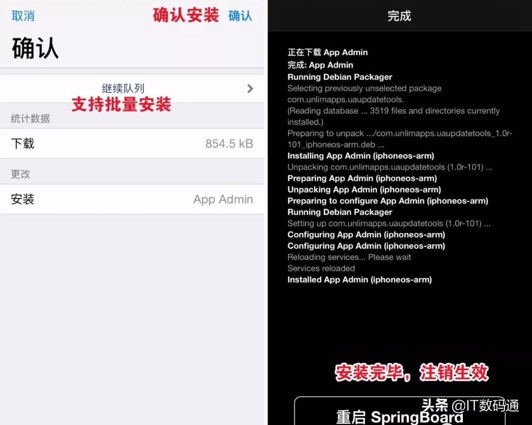 每个插件安装都提供确认界面,点击右上角确认进行安装。安装后需要点击“重启 SpringBoard ”(注销),注销后插件才会生效。继续队列可以将当前想安装的插件放到队列中,继续挑选其他插件进行批量安装。