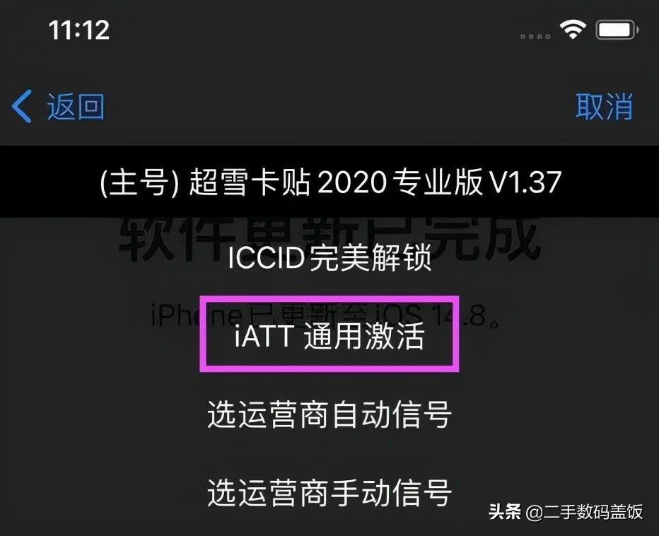 4.弹出的界面中,我们选择 iATT通用激活,然后输入最新的ICCID串码(shumagaifan8朋友圈获取),点击接受