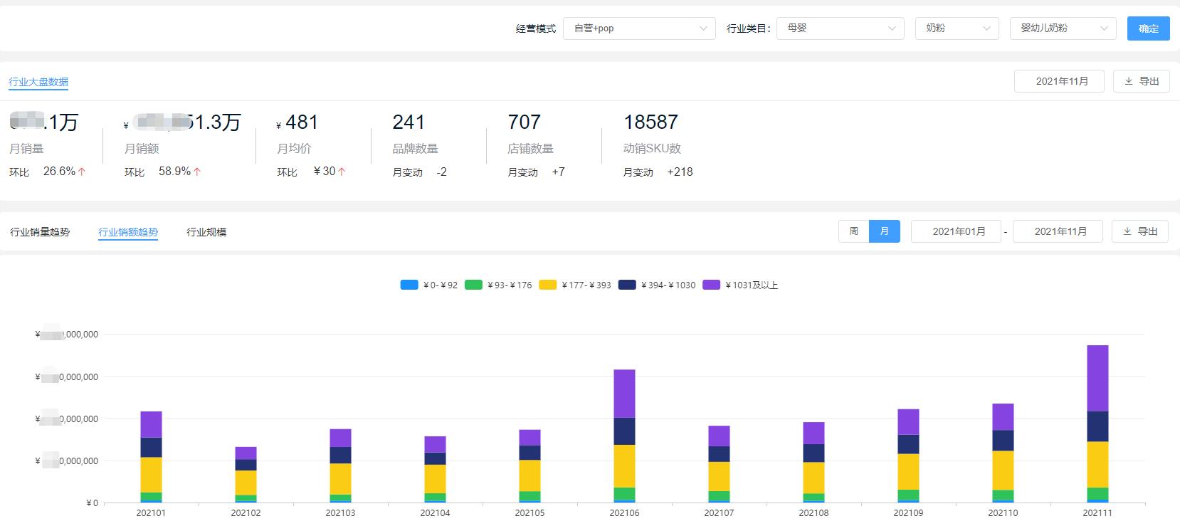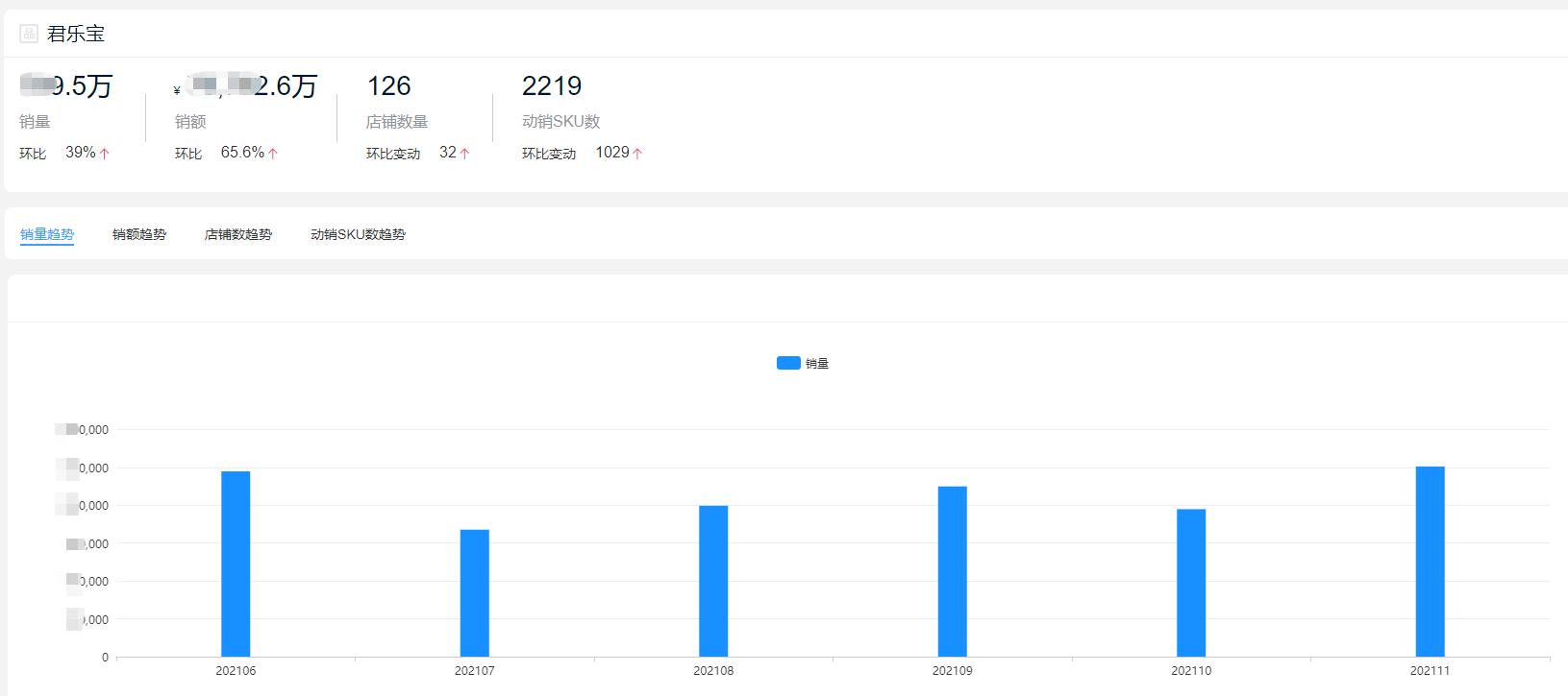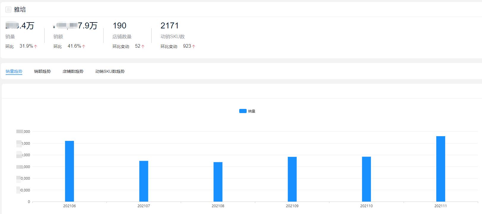 根据统计,今年爱他美整体销售成绩排名第一,全年总销量超960万件,总销售额超34亿元,同比去年大幅增长。目前,京东平台有爱他美相关110余家店铺。双十一和618是两个销售高峰时期,每个月动销sku数超过2000个。