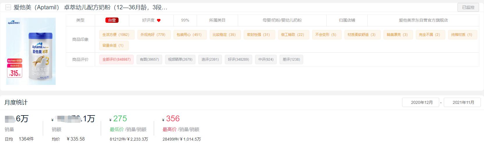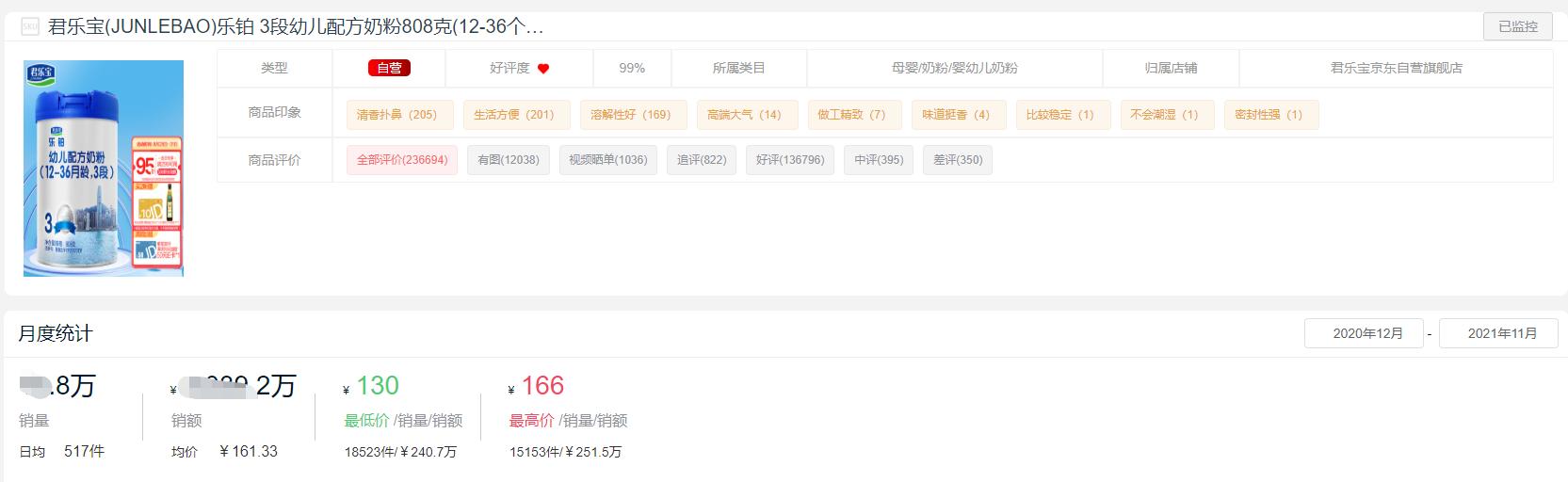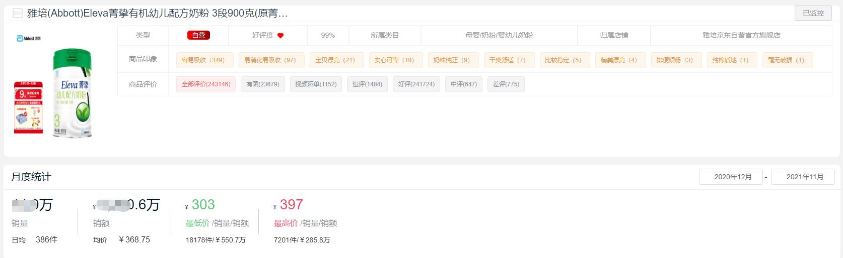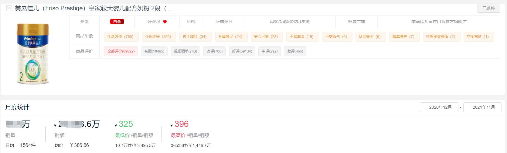 通过热销商品的监控,我们统计到美素佳儿皇家2段奶粉2021年在京东平台累计销售超过53万件,累计销售额超2.1亿元。该款产品的历史最低价曾低至325元,最高为396元。