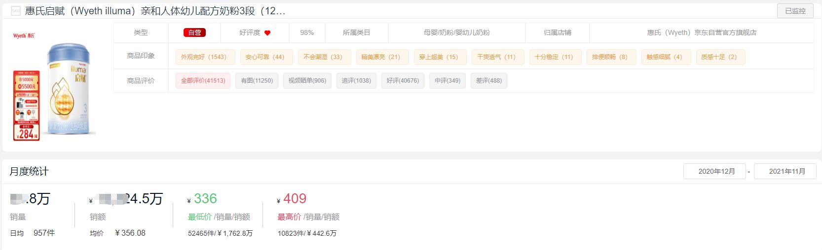 惠氏的热榜商品也是热门商品榜中的常客,今年在京东平台累计销售超33万件,累计销售额超1亿元。该款产品历史最低价曾低至336元,最高为409元。