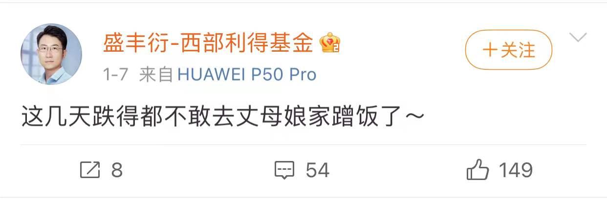 西部利得基金经理盛丰衍的发声显得与众不同——“这几天跌得都不敢去丈母娘家蹭饭了。”