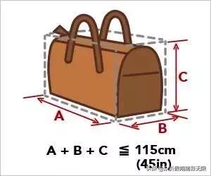 随身行李三边长、宽、高的体积不得超过112厘米或重量不得超过18磅(8 kg)。