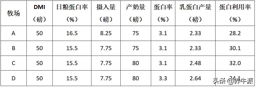 牧场A与上述计算情况相同,牧场B改变了日粮蛋白含量,下调了1个百分点,从16.5%降至15.5%。同时,维持奶牛同等的产奶量和乳成分。牧场C通过改善饲养管理,使奶牛的产奶量从75磅(约33.75kg)增加至80磅(约36kg),从而增加了日粮蛋白的利用率。牧场D通过微调氨基酸平衡,使乳真蛋白率从3.1%增加至3.3%。