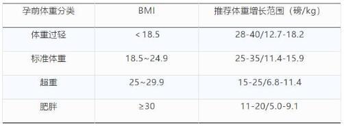 2009年美国医学研究所(IOM)新推荐孕期体重的增重范围,以体重指数(BMI)为指标,根据孕前BMI的不同,单胎孕妇孕期增重的范围如下: