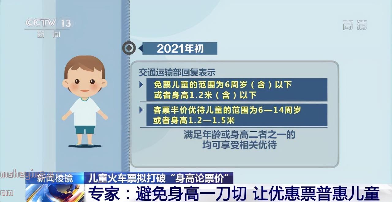 2021年初,有多名网友在网上留言咨询“儿童票优待按身高还是按年龄?”交通运输部回复表示,免票儿童的范围为6周岁(含)以下或者身高1.2米(含)以下;客票半价优待儿童的范围为6—14周岁或者身高1.2—1.5米。满足年龄或身高二者之一的,均可享受相关优待。但这个规定只是针对客运班车和水路客运船舶。