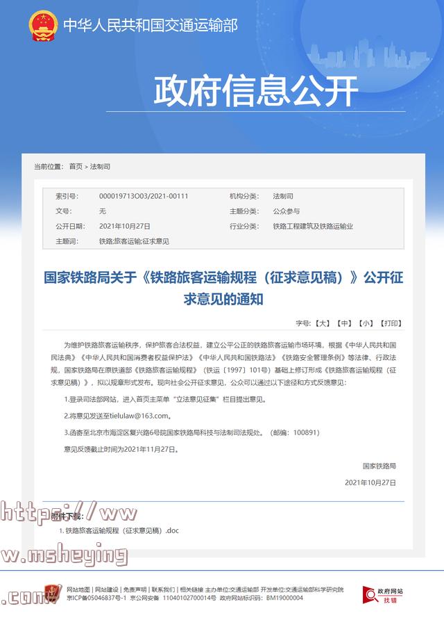 近日,国家铁路局对原铁道部《铁路旅客运输规程》(铁运〔1997〕101号)进行修订,形成《铁路旅客运输规程(修订征求意见稿)》,拟以交通运输部规章形式发布,并向社会公开征求意见,意见反馈截止时间为2021年11月27日。