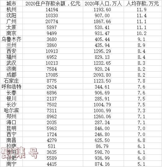 有媒体根据《中国统计年鉴2021》、第七次全国人口普查数据树立了27个省会城市住户的存款数据,发现杭州、沈阳、广州、太原、南京5个省会城市的人均存款超过了10万元,其中杭州达到了11.9万元。