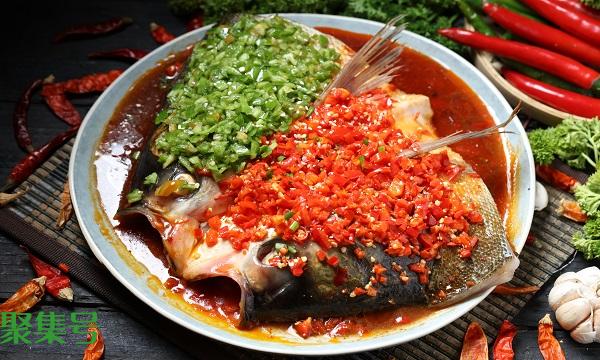 剁椒鱼头是湖南省的传统名菜,属于湘菜系。据传,起源和清代文人黄宗宪有关。通常以鳙鱼鱼头、剁椒为主料,配以豉油、姜、葱、蒜等辅料蒸制而成。菜品色泽红亮、味浓、肉质细嫩。肥而不腻、口感软糯、鲜辣适口。剁椒鱼头,以鱼头的“味鲜”和剁椒的“辣”为一体。火辣辣的红剁椒,覆盖着白嫩嫩的鱼头肉,冒着热腾腾清香四溢的香气。蒸制的方法,鱼头的鲜香被尽量保留在肉质之内,剁椒的味道又恰到好处地渗入到鱼肉当中,入口细嫩晶莹,带着一股温文尔雅的辣味。