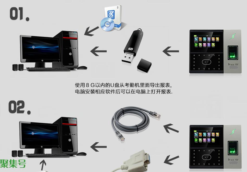 目前,指纹考勤机和人脸识别考勤机最常用的通讯方式,就是网络连接方式。导出考勤记录的方式一般好几种:1、U盘导出考勤记录;2、网线下载考勤记录;3、USB线下载考勤记录;4、串口方式下载考勤记录、5、WIFI 连接下载记录(注:下载记录就是导出记录,也叫采集记录或上传记录)。