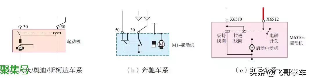 有的电气符号也简单地表达出电器内部的工作原理和电路,如下图所示的起动机的符号,从图中可以看到起动机、电磁开关线圈、电磁开关触点以及它们之间线路的连接关系。