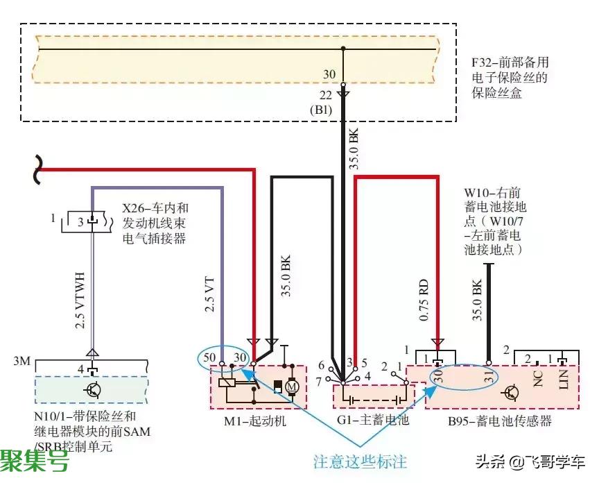 思路二:逆着电路电流的方向,由电源负极(搭铁)开始,经过用电设备、控制装置、开关、保险丝等回到电源正极。