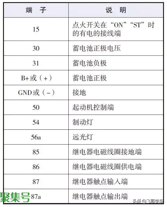 各国汽车制造厂家对端子的标注方法不尽相同,下表所示为德国汽车电路设备端子的部分标注说明。