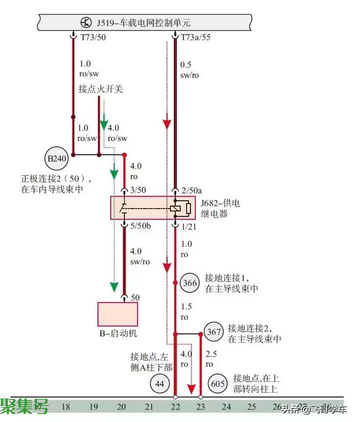 起开关作用,它是利用电磁或其他方法(如热电或电子)控制某一回路的接通或断开,实现用小电流控制大电流,从而减小控制开关触点的电流负荷。在分析带继电器的电路时,要分清主回路和控制回路。下图为一汽大众捷达NF供电继电器工作电路,控制回路和主回路分别用不同颜色的箭头标明。