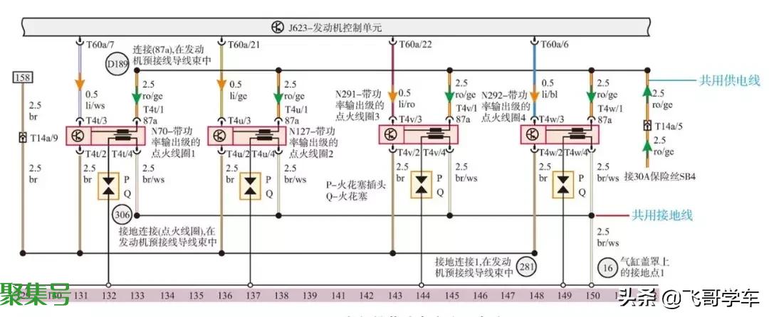 汽车电路中最常见的执行器主要是喷油器、点火线圈、换挡电磁阀、怠速步进电动机、空调压缩机等。执行器要正常工作需要三个信号,即电源、接地和控制信号。控制信号主要由控制单元送出,在汽车电路中,会看到执行器共用电源线、接地线甚至控制线的情况。下图所示电路中,点火线圈N70、N127、N291、N292就共用了电源线和接地线。