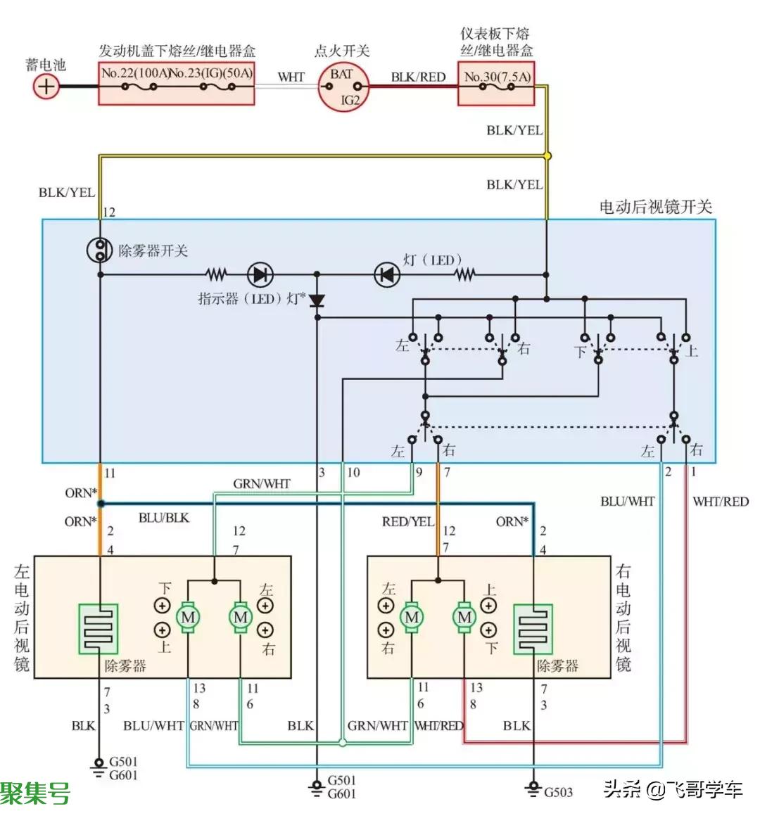 上图为本田雅阁电动后视镜电路。读电路图时,有三种思路: