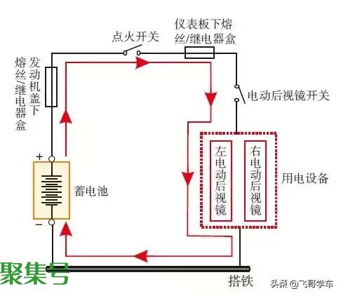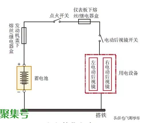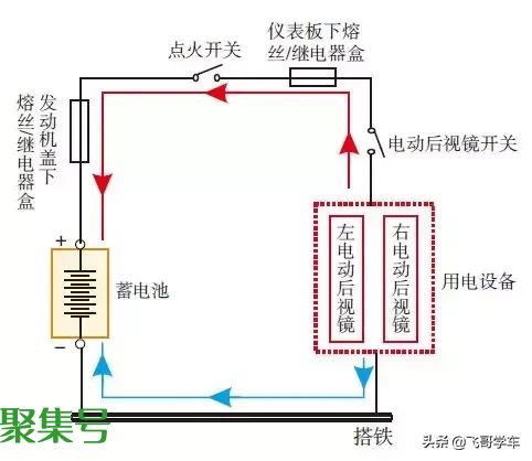 任何一个完整的电路都是由电源、保险丝、开关、控制装置、用电设备、导线等组成的。电流流向必须从电源正极出发,经过保险丝、开关、控制装置、导线等到达用电设备,再经过导线(或搭铁)回到电源负极,构成回路。