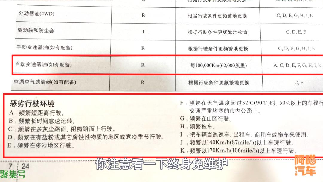 除此之外有些朋友说,说明书上明明写着,变速箱终身免维护不用换,那么是不是真的不用换了?其实只要注意看一下终身免维护,那个旁边是不是有一个“*”,那个“*”下面特别有一行注明,如果行驶恶劣路况,或者如果有以下几种情况,那么建议多长里程换油,而恶劣路况对应的一条很重要的,就是长期低速行驶,或者长期处于拥堵状况。