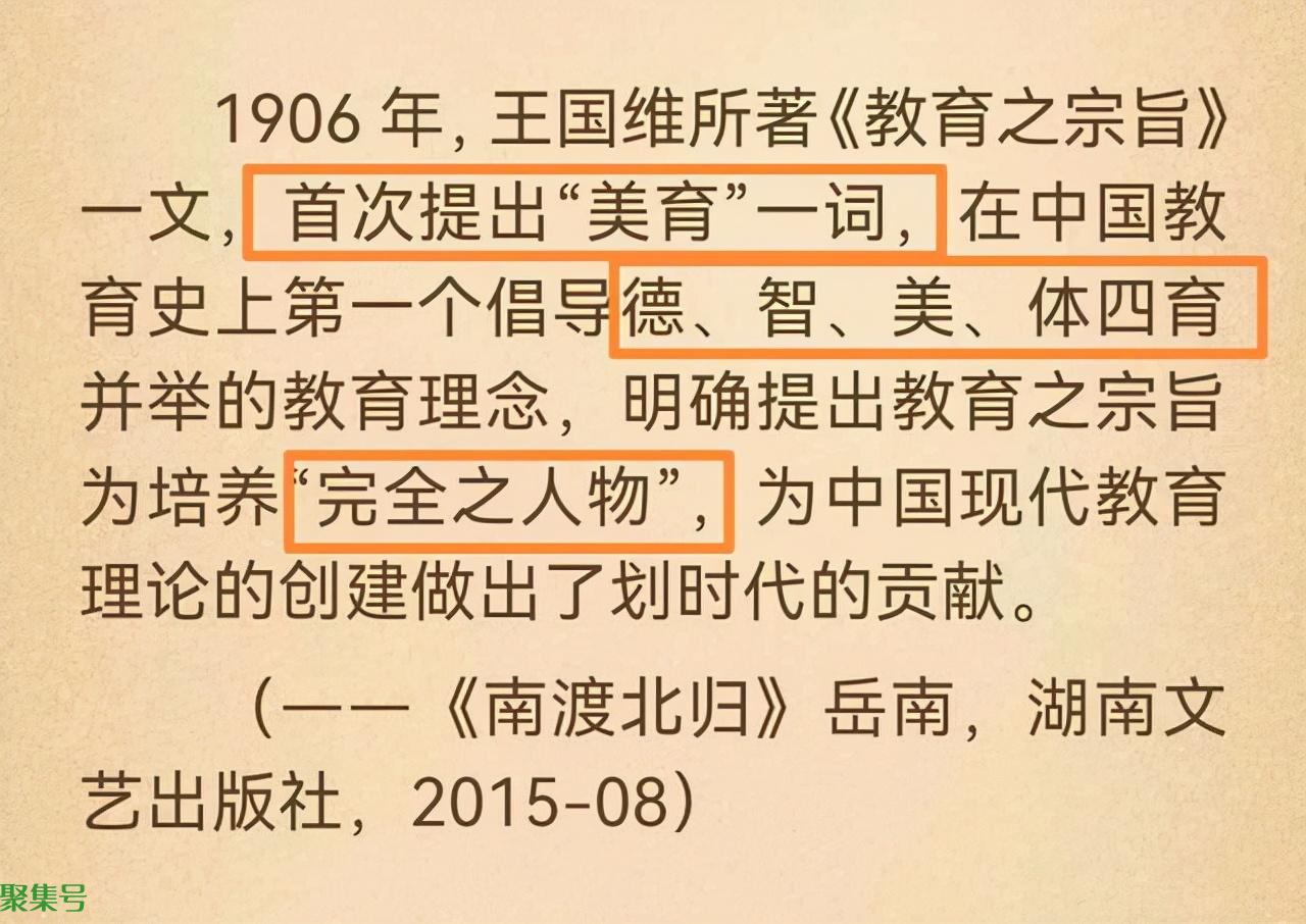 王国维在中国教育史上第一次提出“美育”的概念,提出了“四育并举”的教育理念。王国维的这一贡献,在教育史上具有划时代的意义。但是我们用历史的眼光来看,王国维他这种提法是存在一定缺陷的。我们今天已经不再满足于“四育并举”,我们现在提的是“五育”——再加上一个“劳动”。