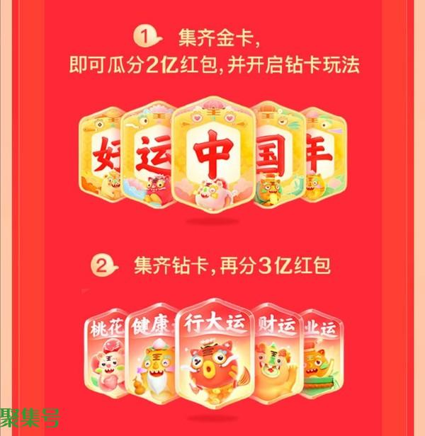 1月22日至1月31日,玩法一、集齐“好运中国年”金卡,即可瓜分2亿红包,并开启钻卡玩法,截至发稿,已有15人集齐;集齐钻卡,再瓜分3亿红包;集齐2-4套钻卡,钻卡奖金翻2-4倍;玩法二、前6666名集齐金卡、前1888名集齐钻卡可额外获得限量足金金虎,指定楼层集齐也可获得;金卡抽足金金饰,卡片越多中奖几率越高;玩法四、金卡投注,赢1000元现金,多投多中。此外,还有团圆红包分5亿、冰雪运动会分5亿、搜索分千万、1亿春节福利天天领、1亿补贴、补贴3亿SVIP特惠购、2亿特惠小度智能屏的活动参与。