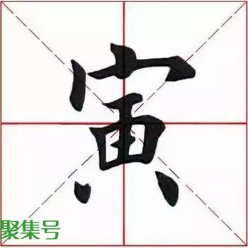 下部上收下展,注意与上部的位置。上面短横的下沿与上部左竖的底端基本平齐,露锋起笔,抗肩,勿重、勿长;中间“由”字不要写大,整体稍抗肩,左轻右重,竖笔与上部首点直对。下面“八”字稍宽:左撇写成左点以化呆板,注意重心与上部左竖的右侧直对,勿重;最后右点起笔对准“由”字的右下角,稍重、稍大,以平衡整字。