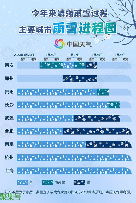 从降雪进程看,甘肃、宁夏、陕西、山西等地降雪主要出现在25日夜间至27日,河南、湖北、安徽、湖南等地降雪主要出现在27至29日。省会级城市中,武汉27日夜间或有暴雪,合肥27日至29日也将有持续降雪。