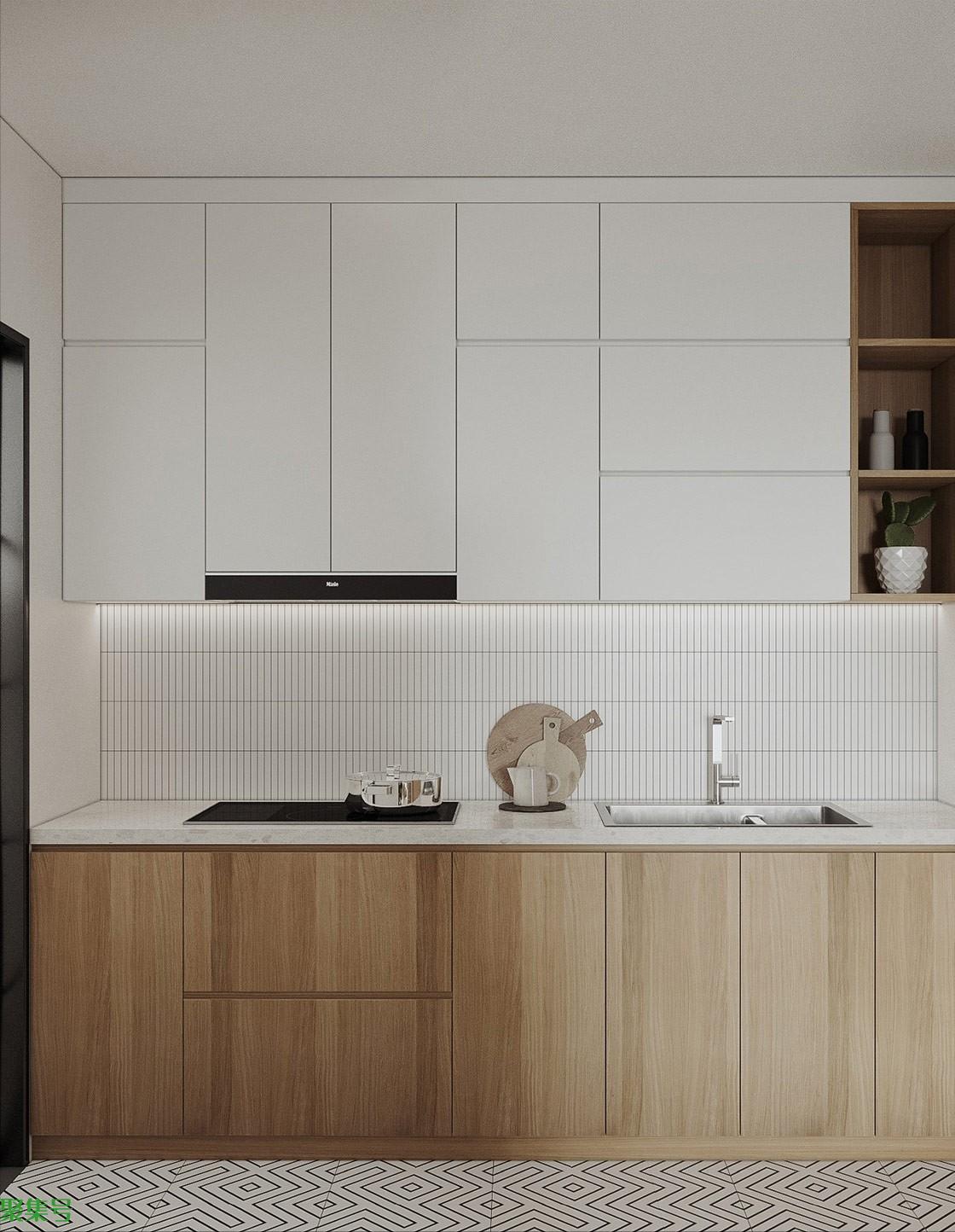 厨房是以白色+原木色为主的一字式布局,看着简单明了,吊柜右侧一列为木质包边的开放式设计,显得柜面不单调,可以摆放盆栽之类的装饰品。地面用花纹瓷砖装饰,丰富的纹理有很强的装饰性。墙面铺贴细腻的条纹瓷砖,方便清洁,内嵌的灯带烘托出温馨和谐的环境。
