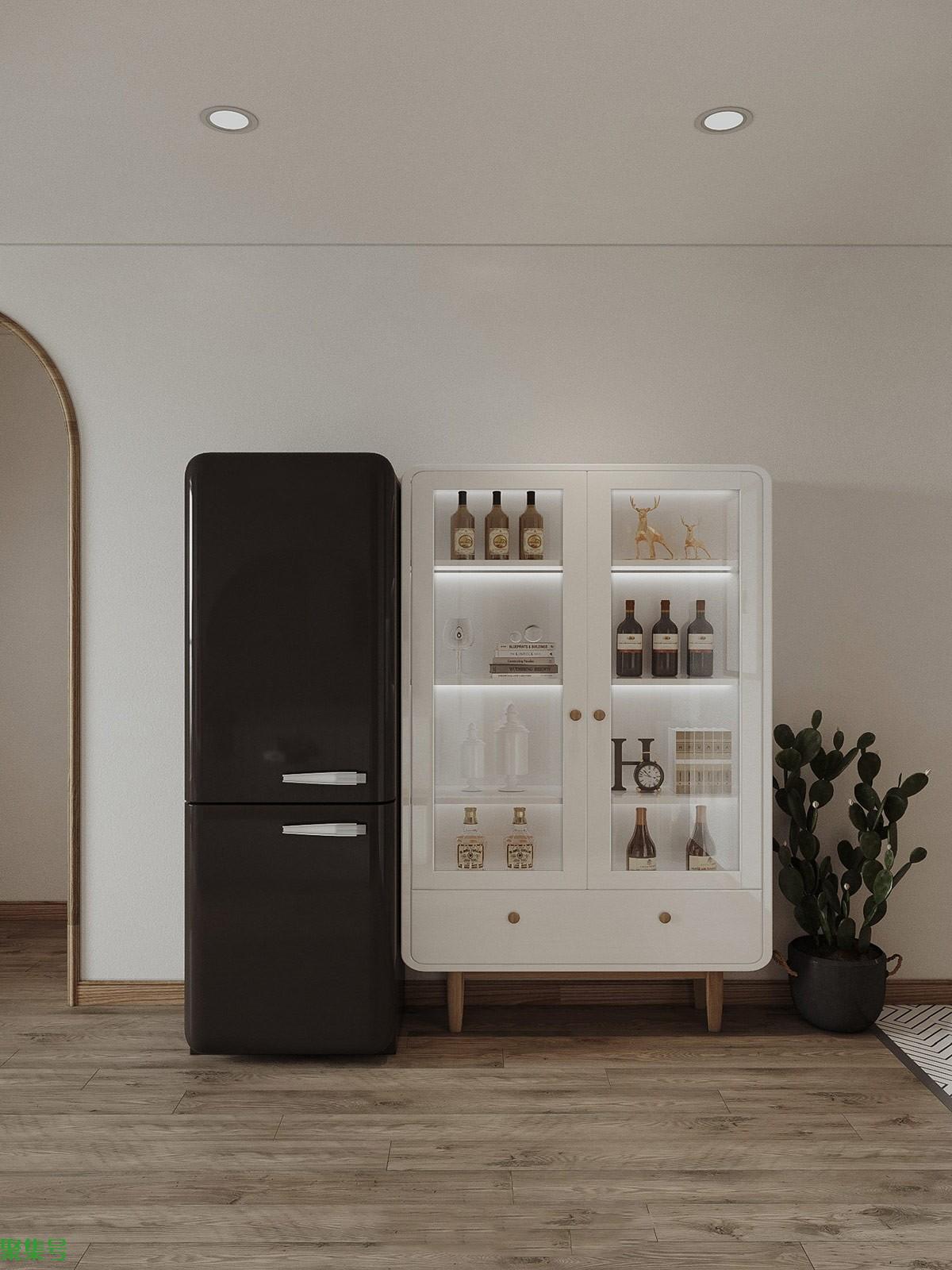 冰箱选用黑色圆角设计,镶上黑色银边把手,为空间带来了高级和时尚感。身边的8格展示柜可以用来藏酒,里面打出的灯光凸显一番质感!