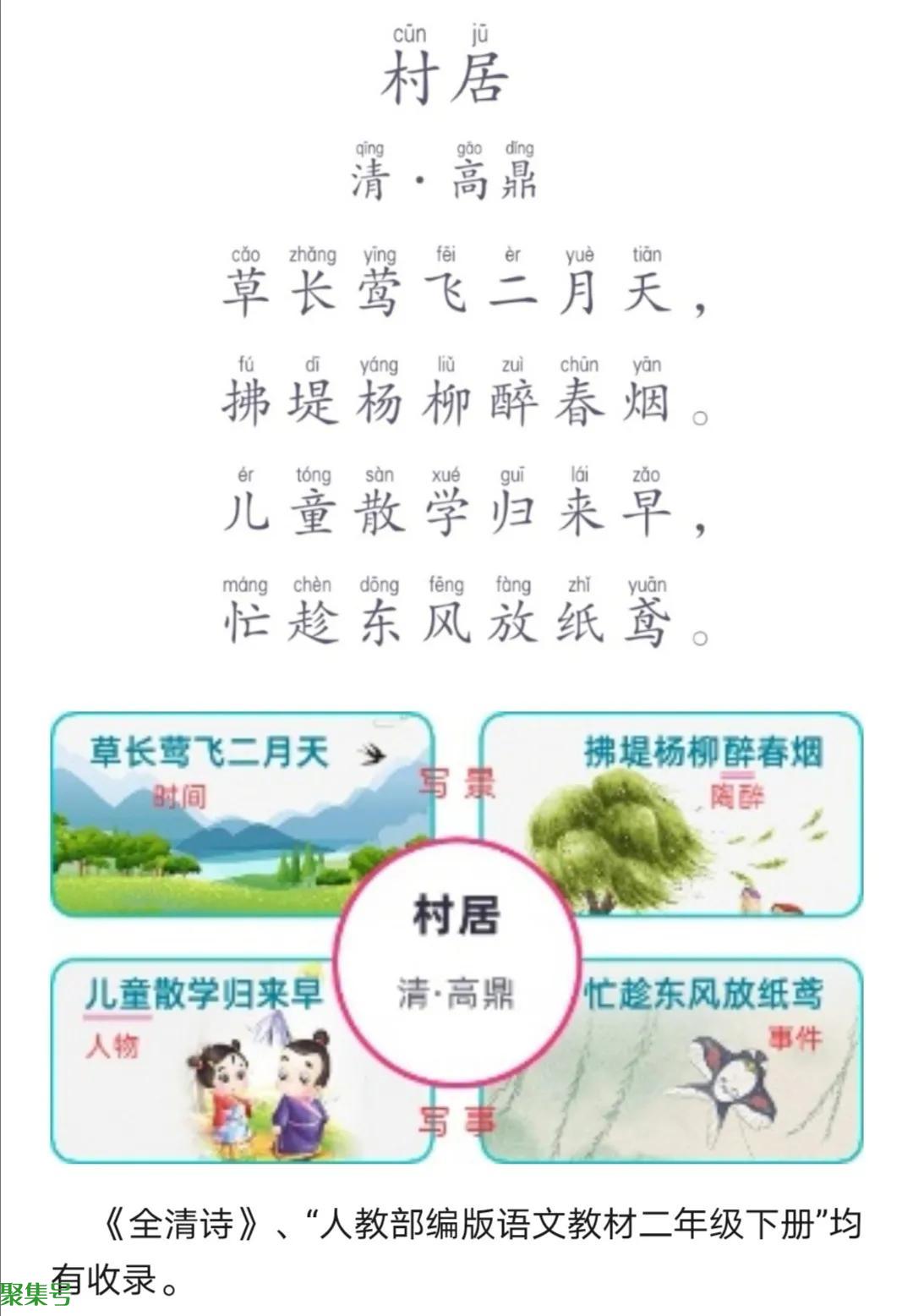 《村居》描写出了一幅春天孩子们在村旁的芳草地上放风筝的图画,是一幅自然景物和活动着的人物融合在一起的、充满生机、春意盎然的农村生活图画。全诗字里行间透出诗人对春天来临的喜悦和赞美。读了这首诗,读者好像跟诗人一起饱览了美丽春景,一起分享着孩子们放风筝时的欢乐。