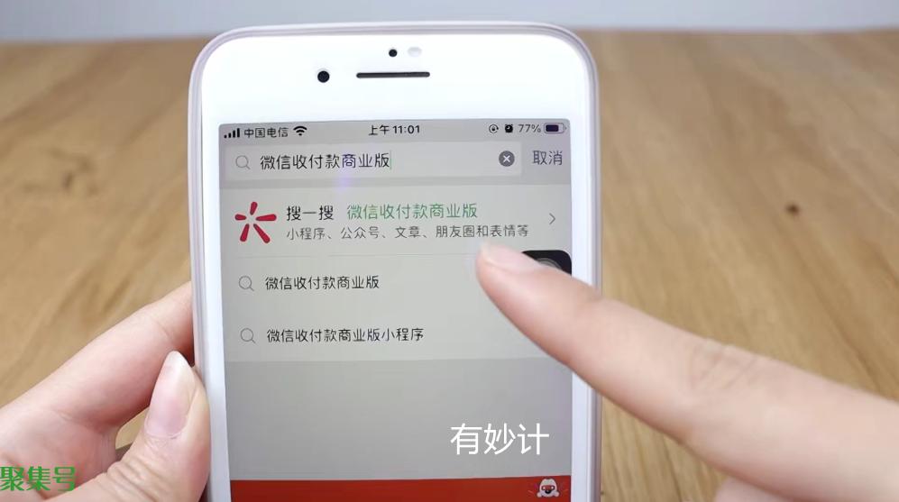 其实我们只需要在手机微信上面就可以申请商户收款码了。大家打开微信,在搜索框里面搜索微信收款商业版,直接点开这个小程序。