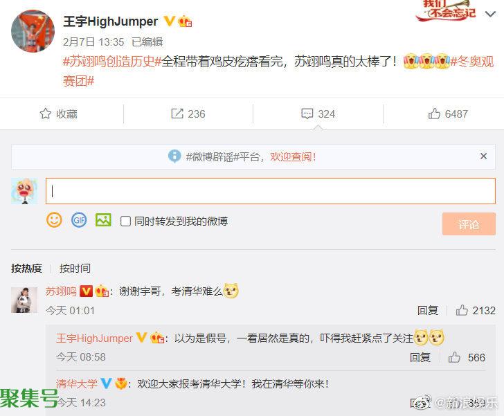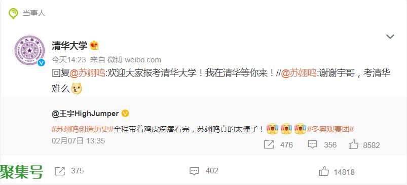 2月22日,@苏翊鸣回复了中国国家田径队队员@王宇HighJumper送给他的祝福,并问道“考清华难么?”王宇回复:“以为是假号,一看居然是真的,吓得我赶紧点了关注。”