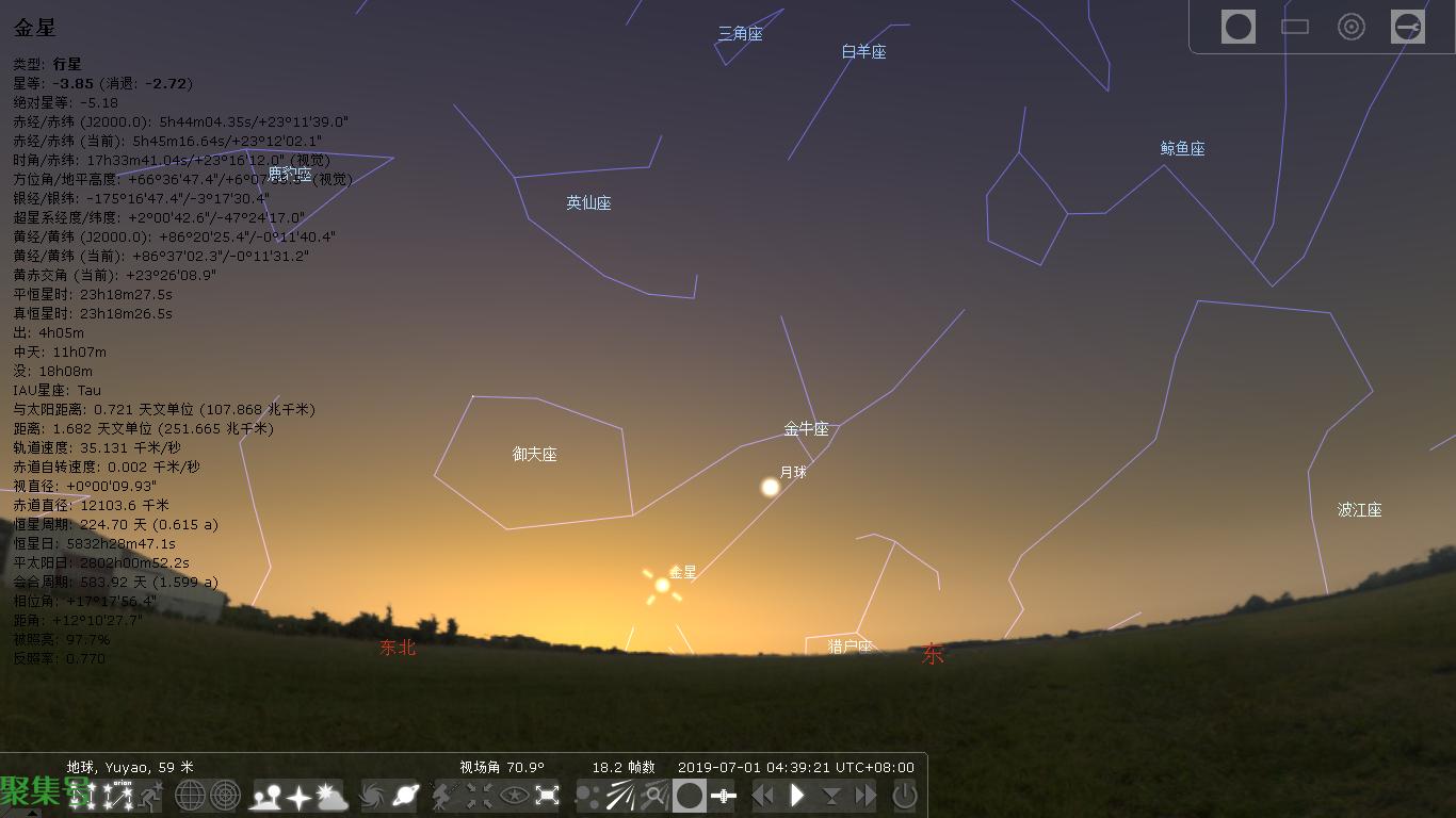 上图是2019年7月1日4:39:21时金星的位置,也就是明天凌晨金星的位置!因为金星即将运行到距离地球最远的位置上合!也就是快要躲到太阳的后面,距离地球约1.682天文单位,与地球同时处于太阳的两端!