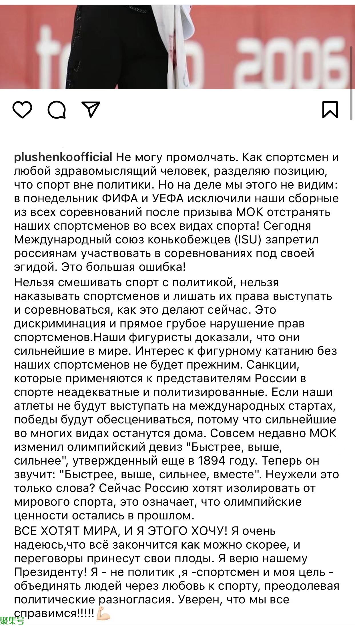 普鲁申科表示:“ISU禁止俄罗斯选手参加比赛。这是一个很大的失误”,“不能混淆体育和政治。不能剥夺处罚选手或参加竞争的权利。这是差别对待,侵害选手的权利”。