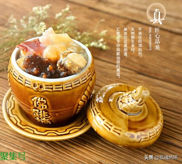 一说,此菜在聚春园成为佳品后,经常有文人墨客闻名而来。这些文人品尝后,赞叹不已,免不了要以诗助兴。一天有一帮秀才宴饮之余,轮流赋诗。其中一位赋诗曰:“坛启荤香飘四邻,佛闻弃禅跳墙来。”意思是此菜香味太诱人,连佛都会启动凡心。另一说,则此菜启坛后浓香四溢,刚巧隔墙有寺,香气使隔墙和尚垂涎欲滴,于是不顾一切清规戒律,越墙而入,请求入席。