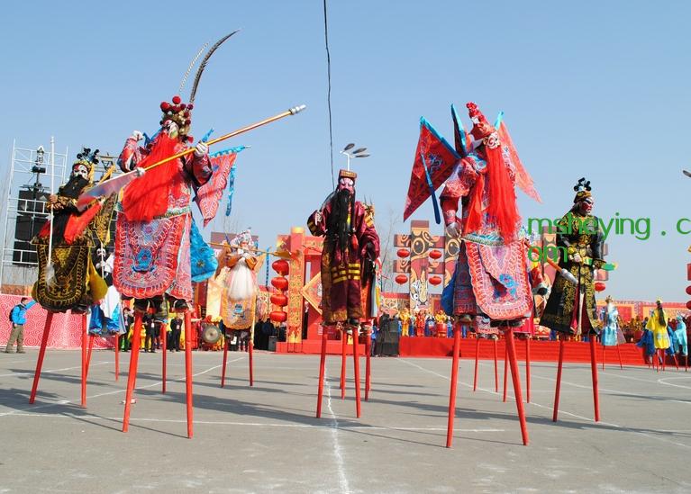 踩高跷,也是春节期间的一项娱乐活动,历史悠久,在《列子.说符篇》就有记载:“宋有兰子者……以双肢长倍其身,属其胫,并驱并驰。”踩高跷也叫“扎高脚”、“踏高跷”,表演的人在两只脚上绑上两三尺高的木质跷棍,表演各种古怪滑稽的动作,小时候基本村村都有这项活动,后来就越来越少了。