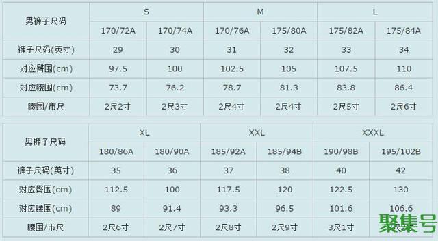 男裤尺码对照表