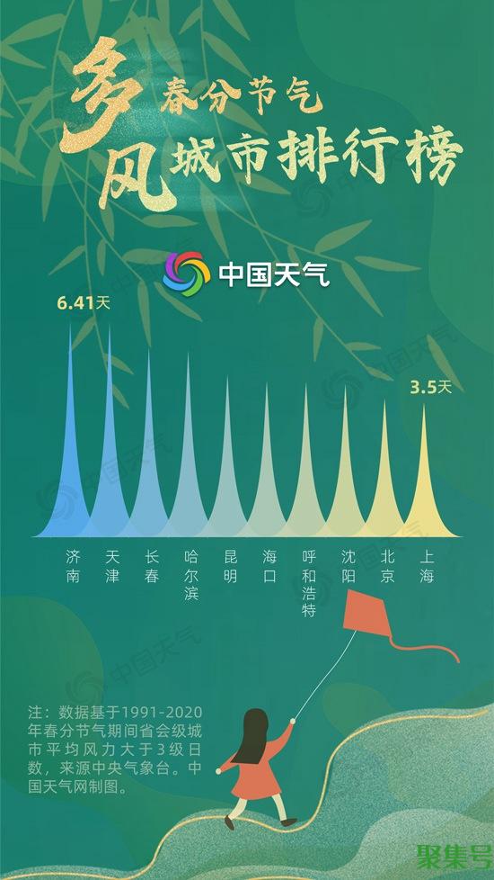 中国天气网盘点近30年大数据发现,春分节气期间,我国风较多的省会级城市大部分来自北方,在多风城市排行榜TOP10中占据7席。其中东北、黄淮等地的风“打卡频率”较高,济南排在第一位,平均每年春分节气期间超过6天平均风力在3级以上。