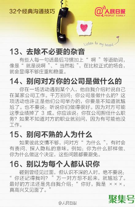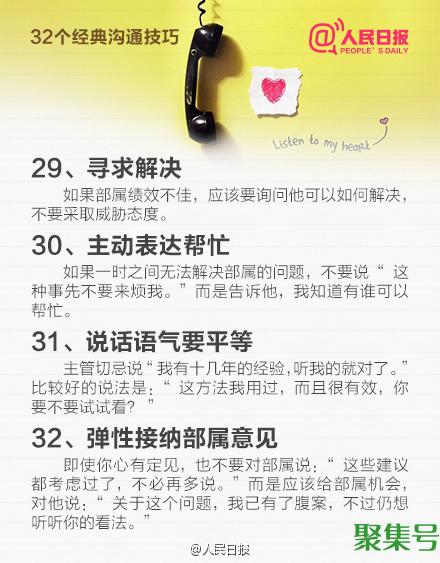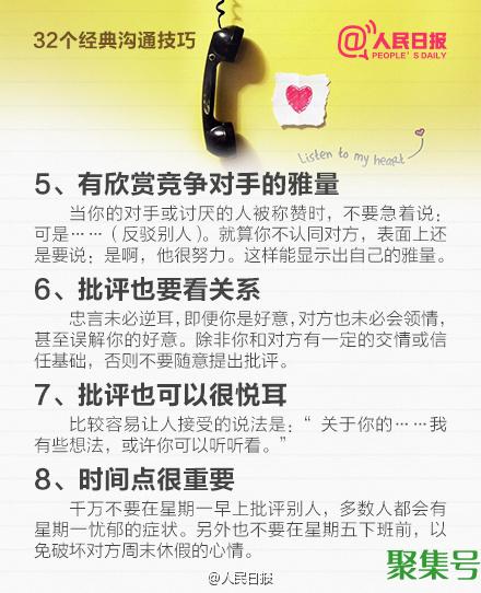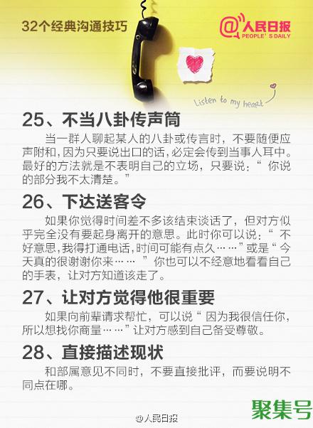 正文 常用的沟通技巧(沟通的基本技巧) kpjjhadmin V管理员 /2022-03-20 20:12:12 /176 阅读 0320 【32个经典沟通技巧,让你在人际相处中如鱼得水】会赞美、会拒绝,无论说什么都恰到好处;即便是批评也让人乐意听……高超的沟通,你也可以做到!①赞美行为而非个人;②透过第三者表达赞美;③批评的同时要提出建议;④微笑避开私人问题;⑤让对方觉得他重要…戳图帮你迅速拥有亲和力! 声明:本文内容及图片来源于读者投稿,本网站无法甄别是否为投稿用户创作以及文章的准确性,本站尊重并保护知识产权,根据《信息网络传播权保护条例》,如果我们转载的作品侵犯了您的权利,请在一个月内通知我们,我们会及时删除。请将本侵权页面网址发送邮件到laoyang1981@qq.com,我们会及时做删除处理。