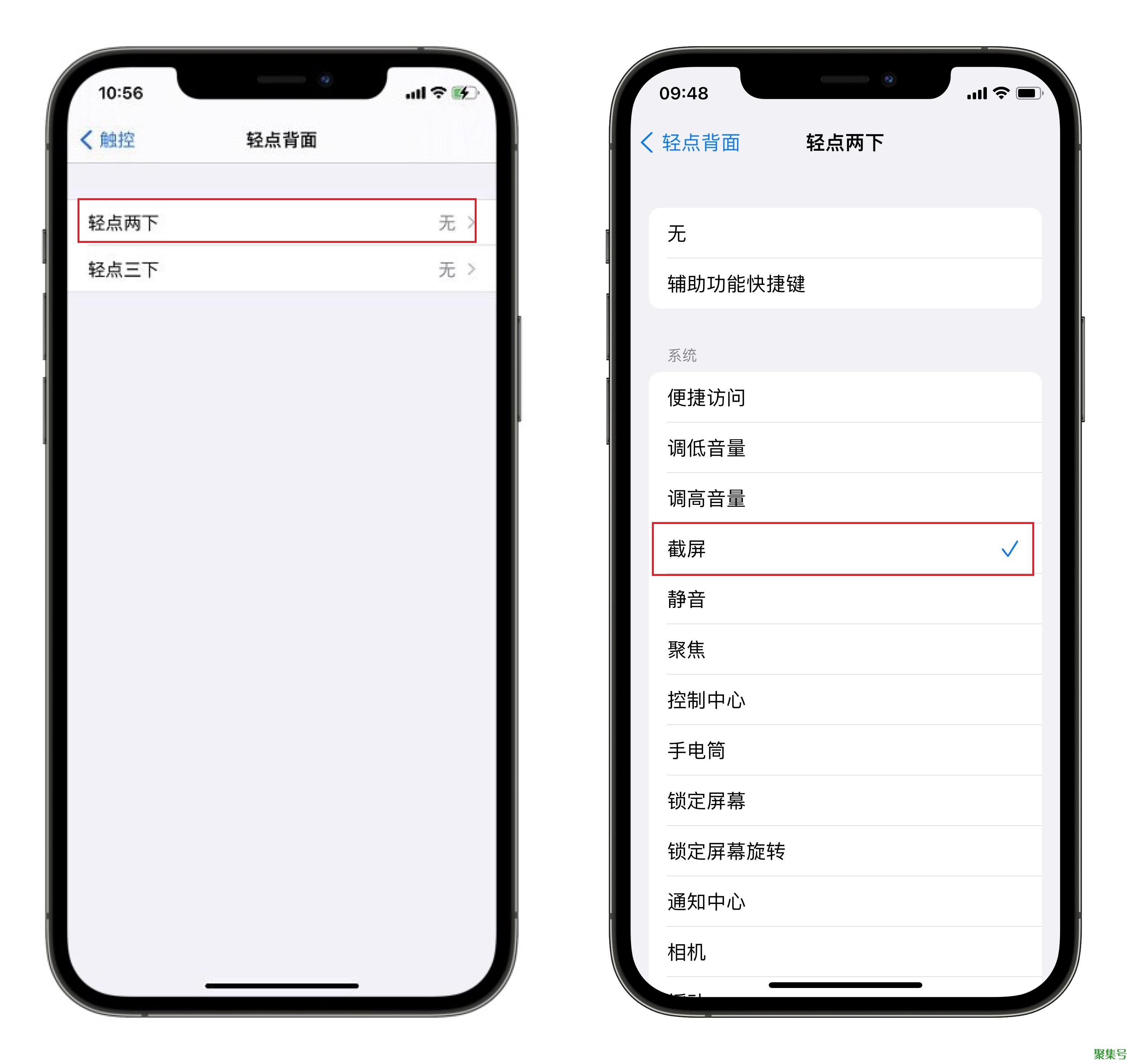然后我们可以选择轻点两下或三下,设置不同的功能,比如我选择「轻点两下」,设置为「截屏」,以后截屏直接用手指,在手机背面双击即可。