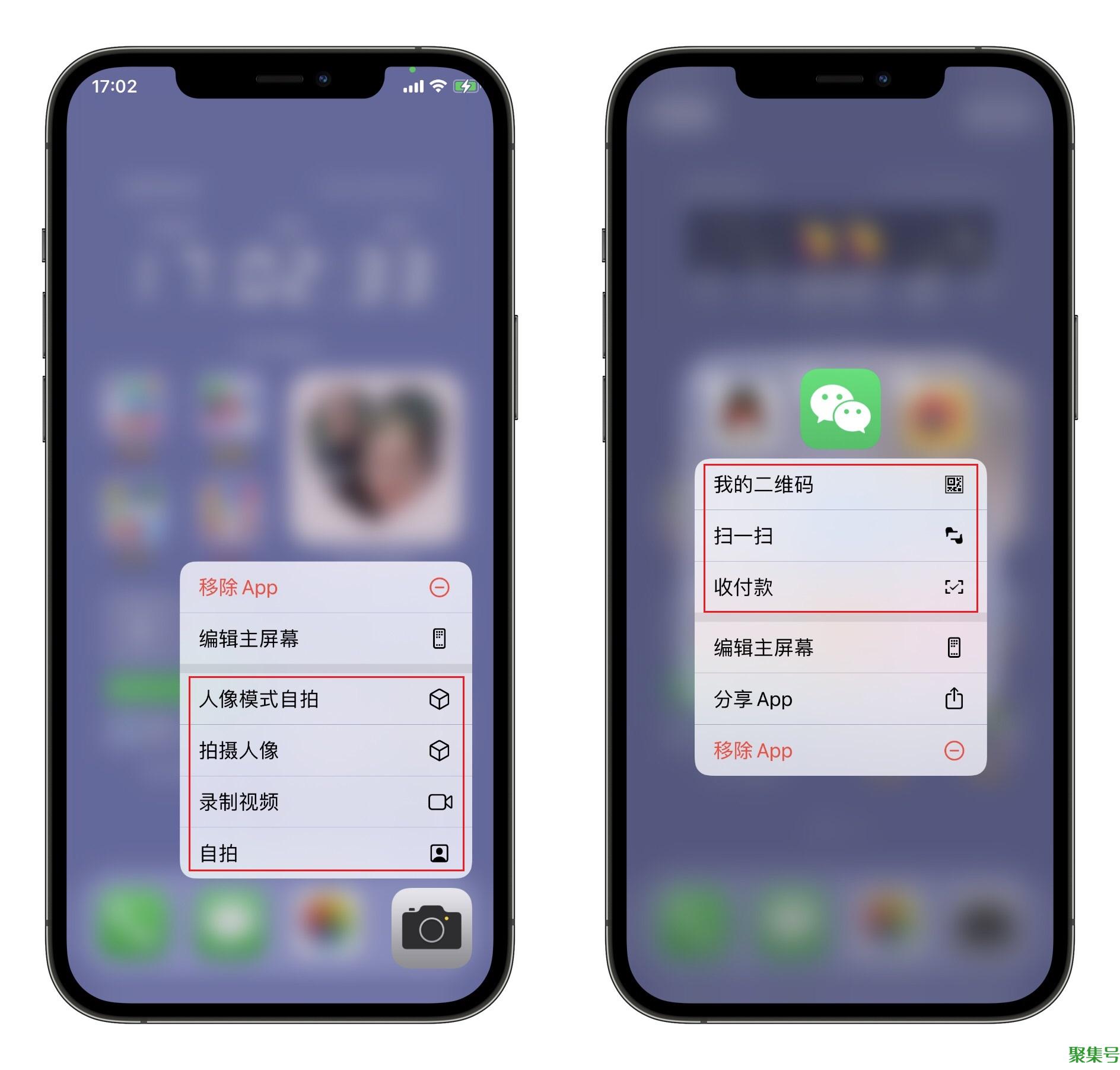 虽然苹果取消了3D Touch,但是在桌面长按应用图标,依旧可以使用快捷功能,比如:长按相机,可以自拍、录制视频、人像模式;长按微信,可以扫一扫、收付款,不需要打开App就能直接使用。