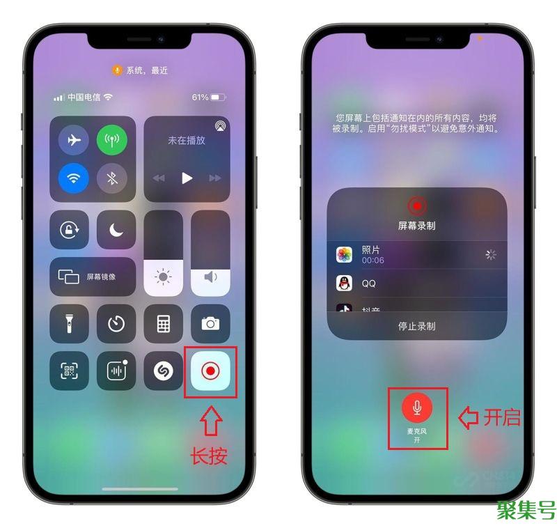 打开控制中心界面,右下角新增了一个录屏按钮,点击就能录制;如果长按2秒还能进入隐藏界面,开启底部的麦克风按钮,就能录屏同时录制外音了。