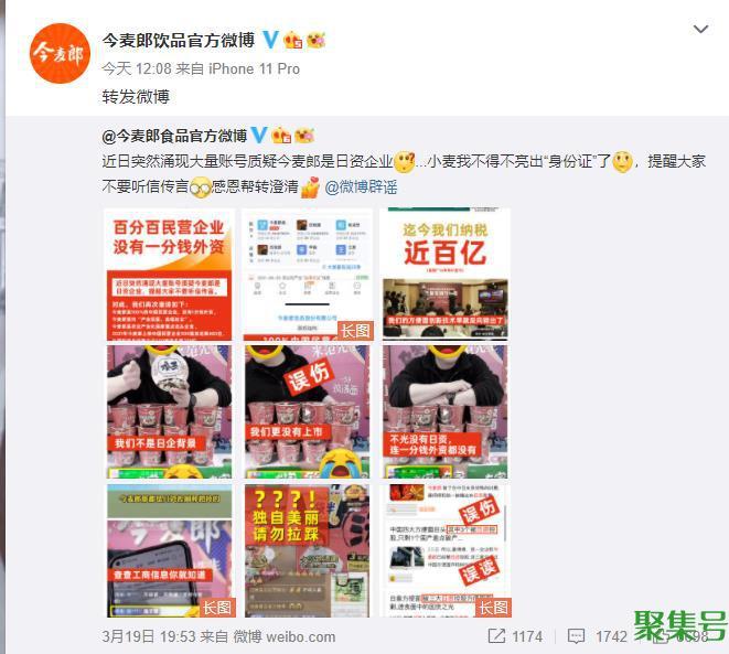3月20日,“今麦郎再发声”登上微博热搜。3月19日晚间,今麦郎再次发微博表示,遭受诸多不明真相的误伤、误读、误解,重申自身中国民营企业身份:百分百民营企业,没有一分钱外资。