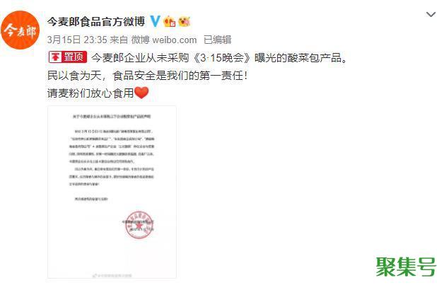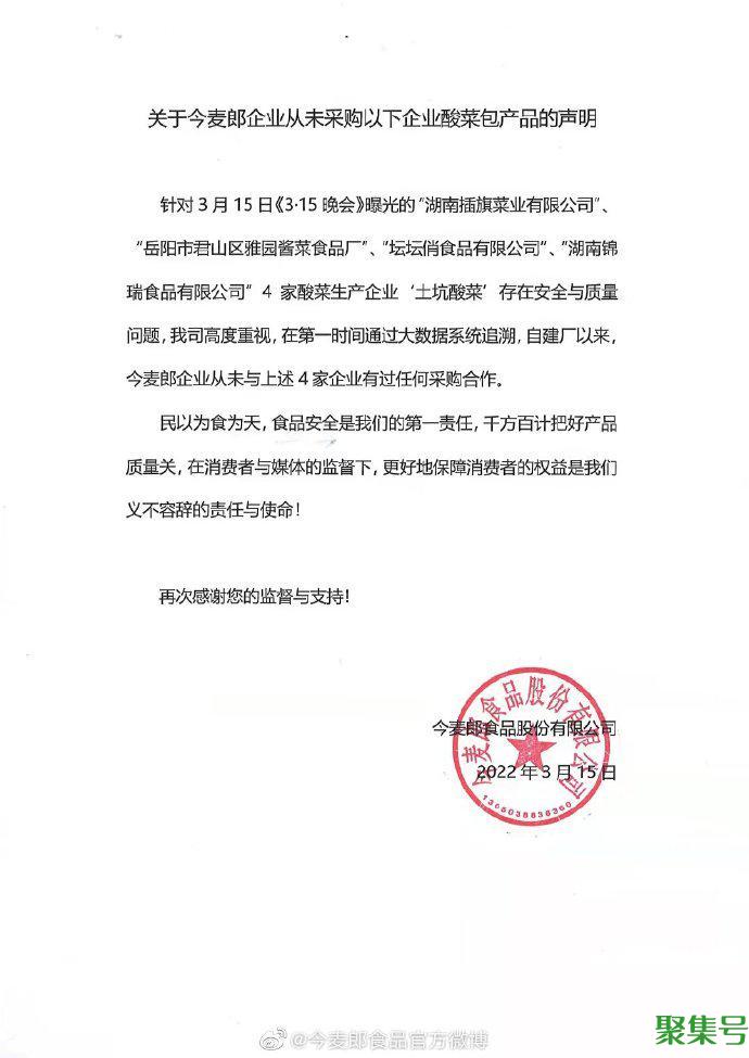 3月15日,今麦郎曾发声明:民以食为天,食品安全是我们的第一责任,请麦粉们放心食用。