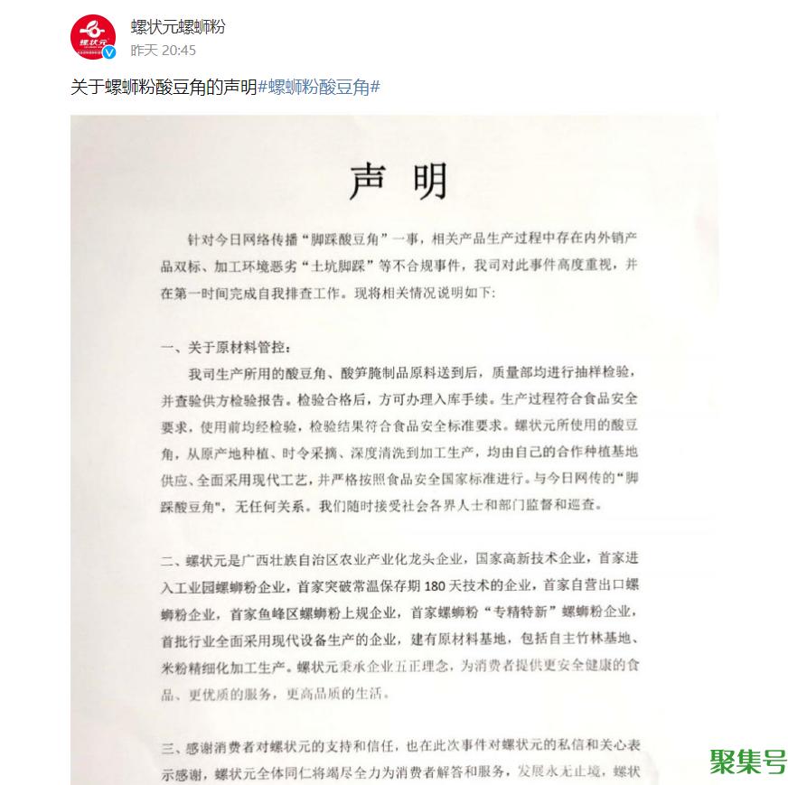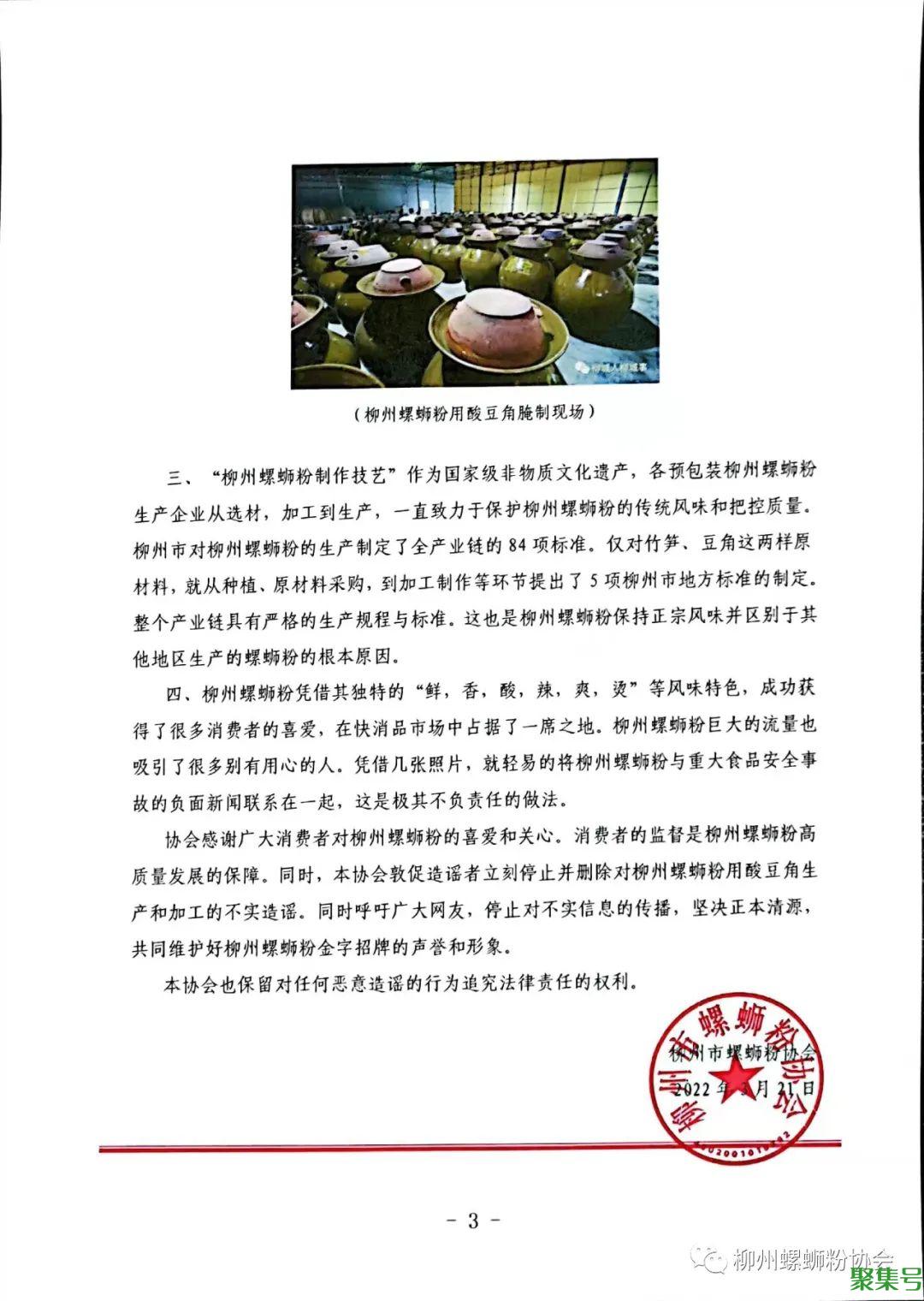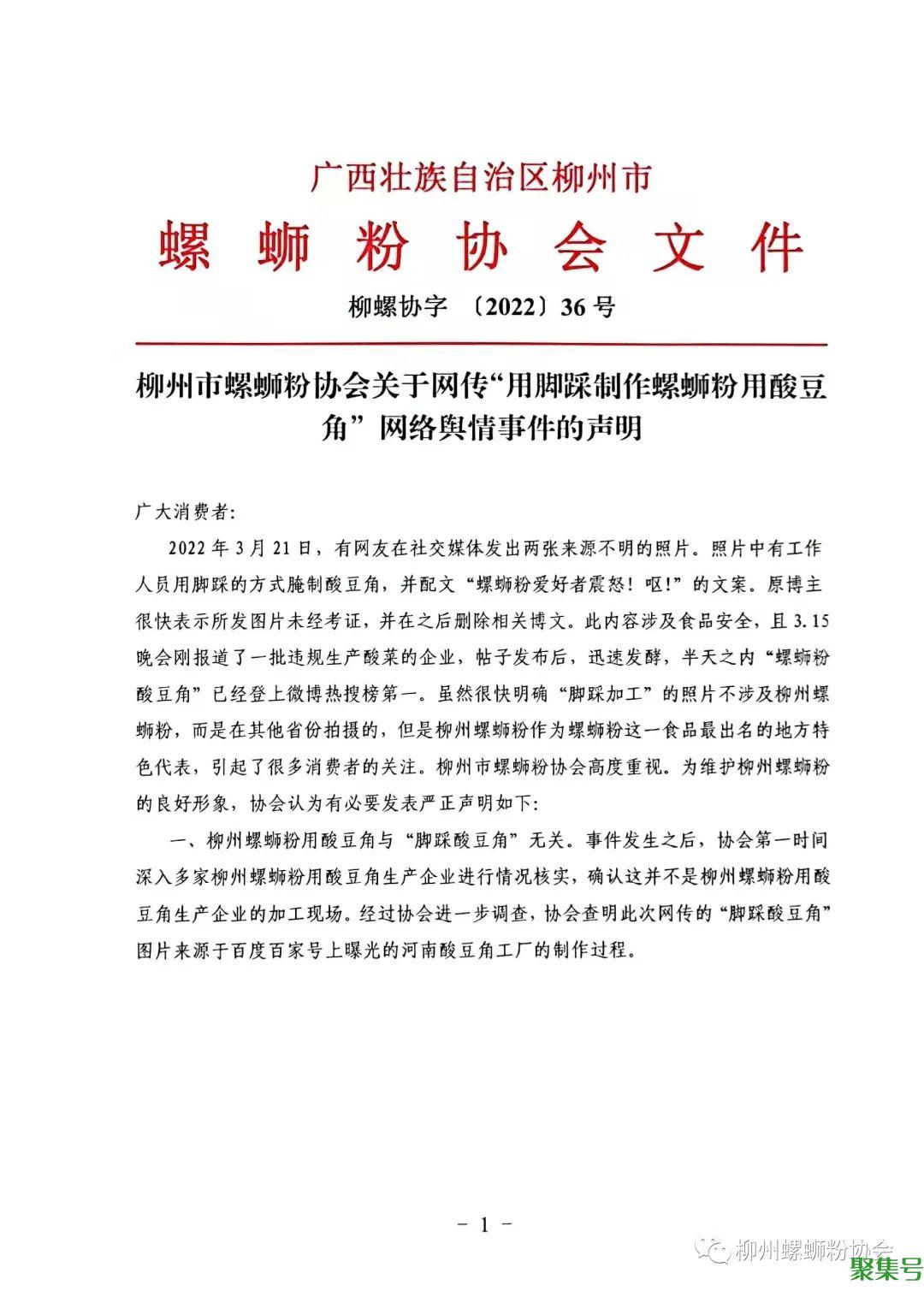 22日上午,柳州螺蛳粉协会发布声明:柳州螺蛳粉用酸豆角与“脚踩酸豆角”无关。事件发生后,协会第一时间深入多家柳州螺蛳粉用酸豆角生产企业进行情况核实,确认这不是柳州螺蛳粉用酸豆角生产企业的加工现场,经过协会进一步调查,协会查明此次网传的“脚踩酸豆角”图片来源于百度百家号上曝光的河南酸豆角工厂的制作过程。